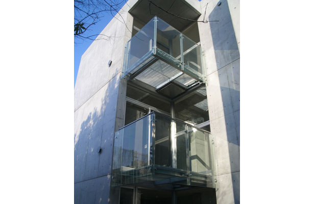 後付けのバルコニー。 後打ちのケミカルアンカーで100*100のH鋼の梁を固定し、スチールグレーチングを床材として用いている。 避難ハッチの設置がやや煩雑であるが、浮遊感のあるバルコニーに仕上がっている。 これに合わせたガラス手摺はステンレスの制作物で、ダブルの支柱に凝ったディテールのポイントフィックス。 この建築家らしい美しい仕上がりになっている。