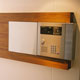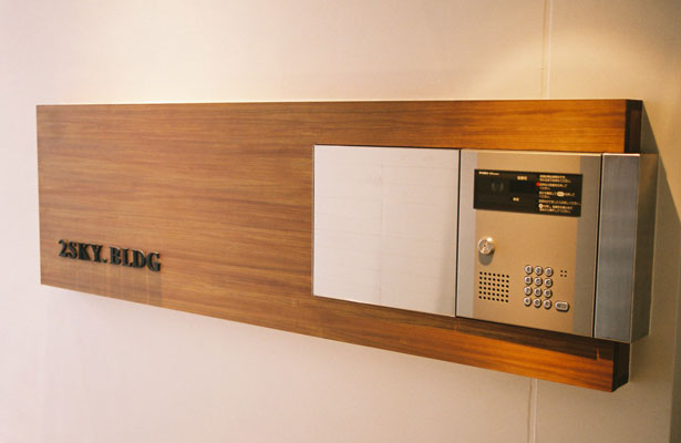 スチールアングルの下地に集成材を組み合わせた館名板に集合インターフォンとテナントネームプレートを合わせたもの。木材の加工は本業ではないものの、簡単な加工はできるだけ自社にて行っている。 |