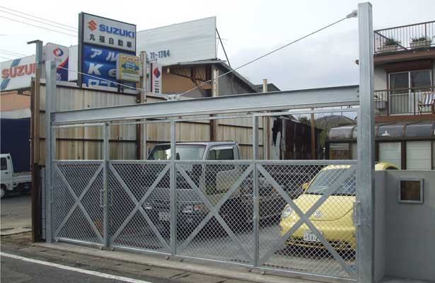 スチールアングルの枠に平打ちした特殊なエキスパンドメタルをはめ込み、溶融亜鉛メッキで表面処理したフェンス。 |