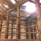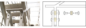 支柱はフラットバー3枚を溶接したビルトH。地震の揺れを逃すため、最上部に庇をのせてボルトで抜け止めしただけで、固定していない。